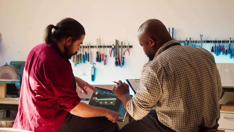 BIPOC artisan and apprentice comparing wood art piece schematic with CAD software 3D render on laptop. Woodworking experts in studio crosscheck drawing on clipboard with notebook blueprint, camera A Pro Video