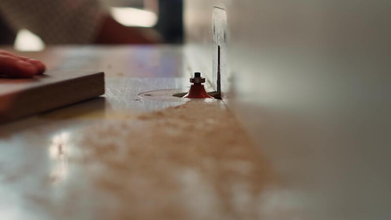 Carpenter in studio puts wood block through spindle moulder, creating smooth edges on wooden pieces. Cabinetmaker in joinery using heavy machinery to craft joints for furniture, camera A close up Pro Video