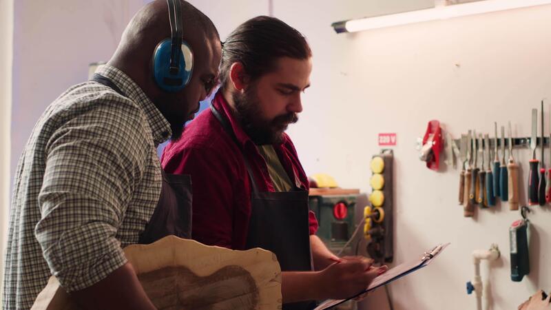 Carpenter and colleague looking over technical schematics, brainstorming ideas for wooden object. Master and apprentice analyzing blueprints to execute furniture assembling project, camera A Pro Video