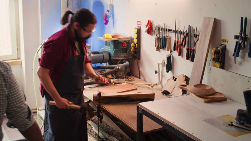 Woodworker using bench vise to hold lumber block, carving intricate designs into wood using chisel and hammer. Craftsperson using vice tool to clamp piece of wood, shaping log with tools, camera B Pro Video