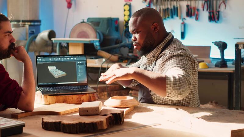 Carpenter looking over blueprints schematics on laptop in CAD software with apprentice. Woodworkers designing custom 3D furniture on notebook in studio, preparing for client order, camera A Pro Video