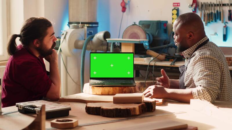 Joyous cabinetmaker looks over blueprints schematics on isolated screen laptop in CAD software with apprentice. Smiling artisan and colleague designing custom 3D furniture on mockup notebook, camera A Pro Video