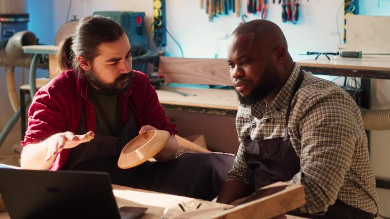 Woodworker looking over blueprints on laptop, brainstorming with african american apprentice. Team of manufacturers discussing furniture assembly schematics on notebook in studio, camera A Pro Video