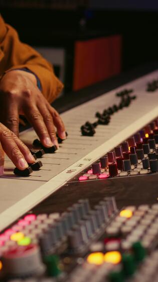 Vertical African american producer uses control desk with automatic equalizer, mixer and sliders to edit tracks in post production. Sound engineer processing audio recordings, mixing console. Camera B. Pro Video
