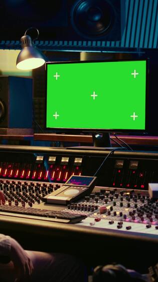 Vertical Tracking engineer watching tutorials online to learn mixing and mastering techniques, greenscreen display on pc and processing sounds. Artist technician operates control room switchers. Camera B. Pro Video