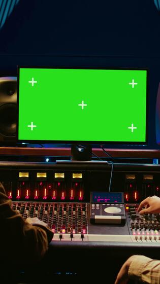 Vertical Diverse producers mixing and mastering tracks with mockup display on computer, recording before adding effects in post production. Artist and sound engineer twisting control desk knobs. Camera B. Pro Video