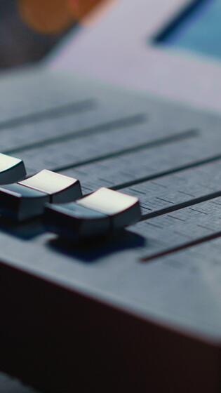 Vertical Sound engineer operating on motorized faders controller in professional studio, editing and mixing tracks to create a song. Audio technician works with sliders and soundboard panel. Camera A. Pro Video
