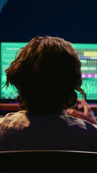 Vertical Mixer producer develops audio by editing recordings and integrating additional sounds using buttons on mixing console. Engineer in sound design uses motorized faders at production studio. Camera B. Pro Video