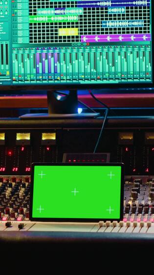 Vertical Audio technician working with music recording software and editing tunes, mixing console and control panel board in post production studio. Producer operating technical equipment. Camera A. Pro Video