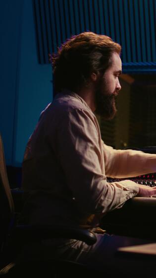 Vertical Professional tracking engineer editing music by adding sound effects in control room at studio, recording tracks and using mixing console. Producer operates technical equipment. Camera B. Pro Video