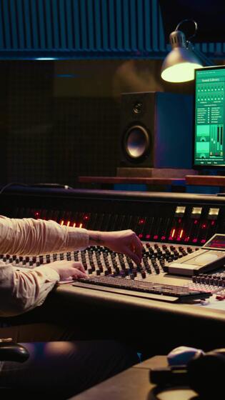 Vertical Sound engineer mixing and mastering tracks in professional recording studio, working with daw software and pushing sliders to adjust volume levels and edit audio recordings. Control room. Camera B. Pro Video