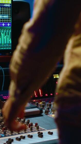 Vertical Music producer editing tracks with mixing console and audio software in studio, pressing key buttons and twisting knobs in control room. Sound engineer producing tunes and adjusting volume. Camera A. Pro Video