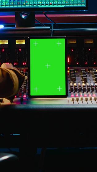 Vertical African american audio technician mixing and editing tracks with greenscreen on tablet, working in professional post production studio. Producer creating new tunes for his album. Camera A. Pro Video