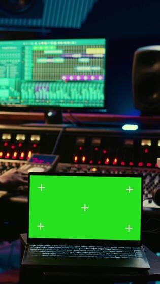 Vertical African american artist working with mockup on display in control room, mixing and mastering tracks with audio console and buttons or knobs. Music producer recording and editing sounds. Camera B. Pro Video