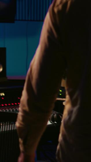 Vertical Sound designer recording tunes to create a new song in control room, working on his new album with mixing console and faders. Audio technician producing tracks, pushing sliders. Camera B. Pro Video