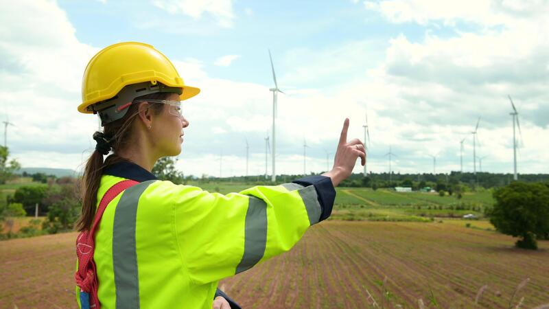 Close up engineering woman hand is touching virtual reality Analytics engineering data in a field over electrical turbines background Free Video