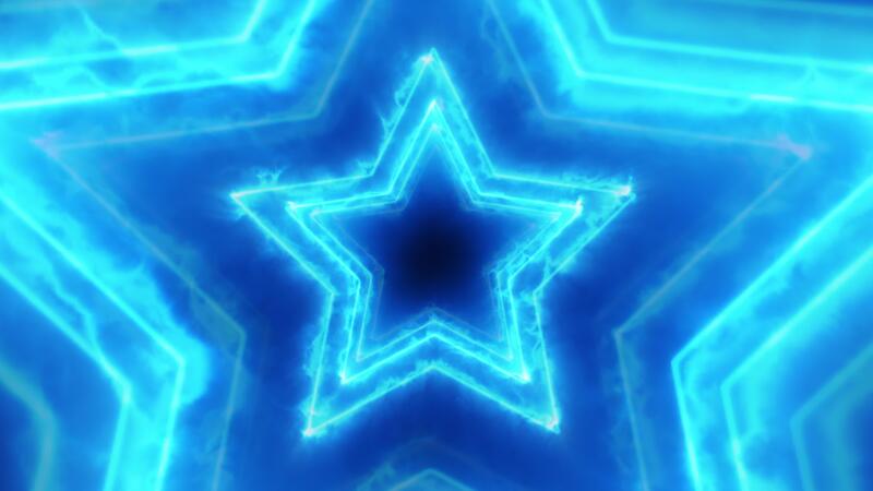 Abstract motion of glowing energetic plasma star shape. Blue neon colored bright fog lines on a black background. Radial concentric star shapes flashing pattern. 4k 60fps loop. Pro Video