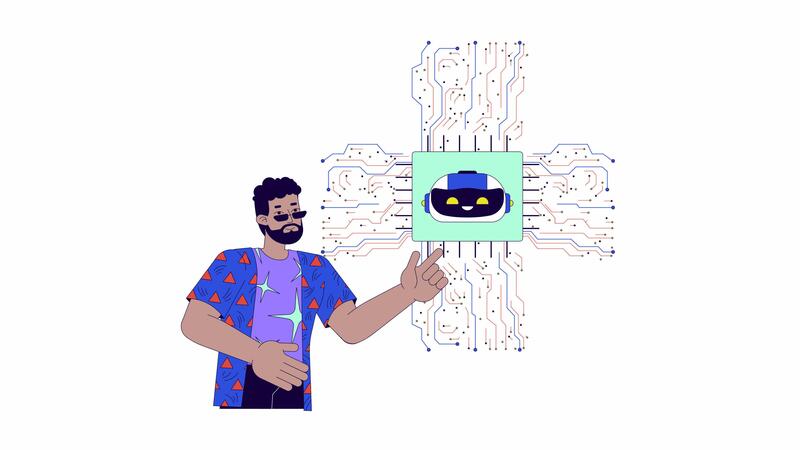 AI optimized hardware line 2D animation. Intelligence artificial chip with black man 4K motion graphic. Male engineer. Microchip circuit linear animated cartoon flat concept, white background Pro Video