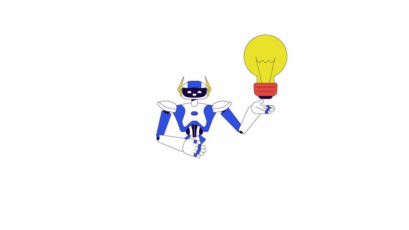 Robot assistant generating idea line 2D character animation. Lightbulb holding flat color cartoon 4K , alpha channel. Tech innovation. Robotics humanoid animated personage on white background Pro Video