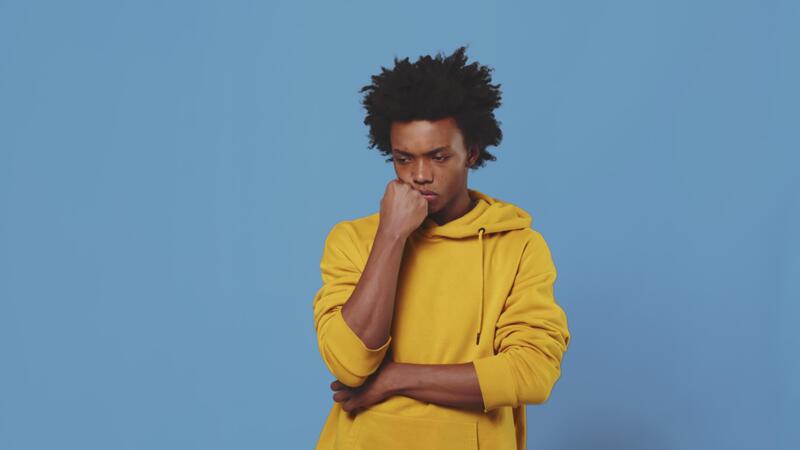 Young black guy thinking with a perplexed face stroking his chin with a hand on a blue background in a studio. Concept of searching for interesting and useful activities Pro Video