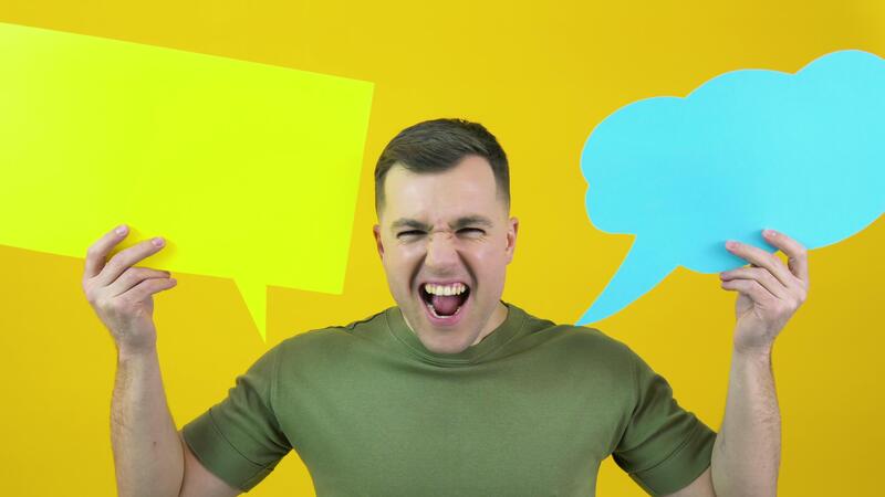 A man holds two backgrounds for the insert text and shouts loudly in the frame. The guy is standing in front of a yellow background with yellow and blue posters for text in his hands Pro Video