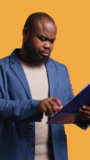Vertical Accountant doing profit analysis for company, browsing files, isolated over studio background. Worker doing financial budgeting and forecasting, complaining about financial figures, camera B Pro Video