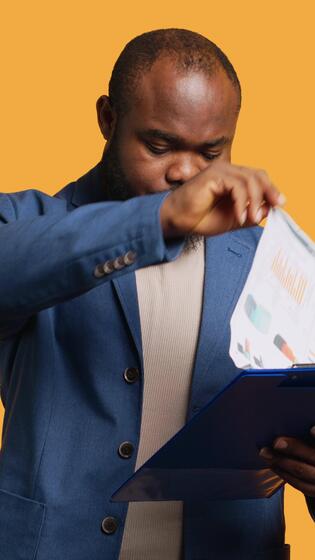 Vertical Accountant doing profit analysis for company, feeling perplexed by confusing data, studio background. Worker doing financial budgeting, scratching head, puzzled by financial figures, camera A Pro Video