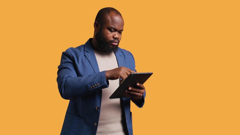 Man frowning while adding payment method on website, seeing insufficient funds error, studio background. Upset person getting transaction rejected, wrongly typing credit card data on tablet, camera B Pro Video