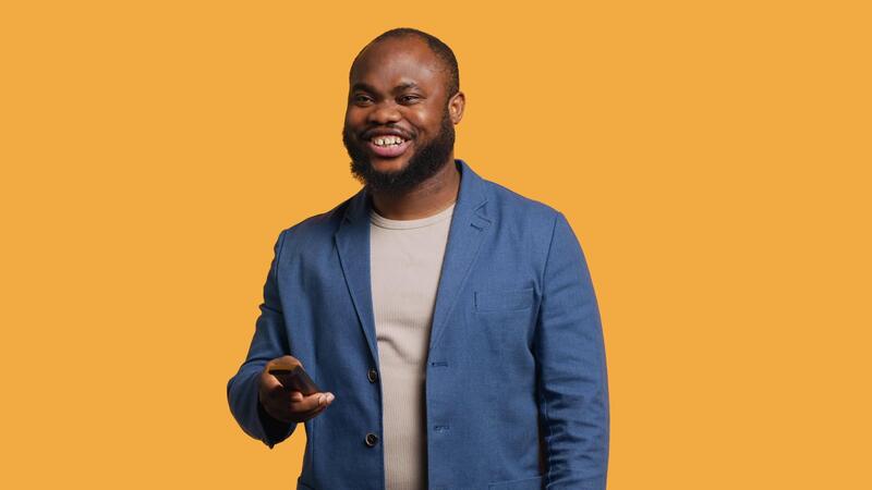 Man zapping through various TV channels, looking for entertaining content to watch, studio background. Person using remote control to select television station, switching between them, camera A Pro Video