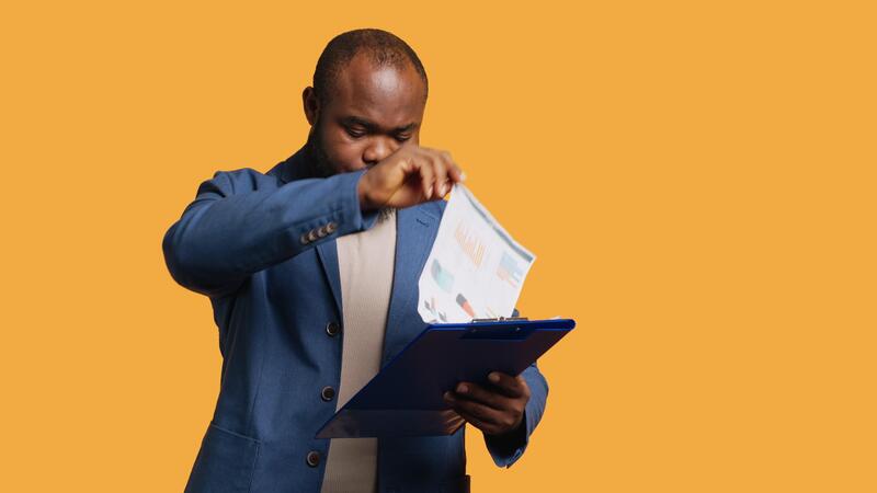 Accountant doing profit analysis for company, feeling perplexed by confusing data, studio background. Worker doing financial budgeting, scratching head, puzzled by financial figures, camera A Pro Video