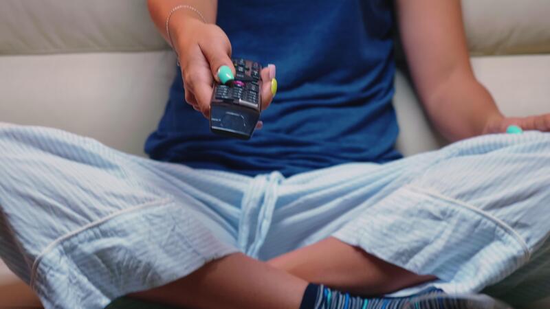 Close up shot of controller in woman's hand while sitting on couch. Remote control in the hands of person pointing to TV, pressing the button and changing channels sitting in front of television. Pro Video