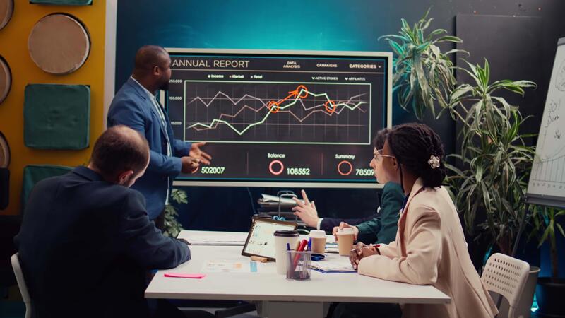 Diverse colleagues reviewing monthly sales infographics on interactive board, measuring feedback on previous initiatives for future improvements. Management team in a meeting. Camera B. Pro Video