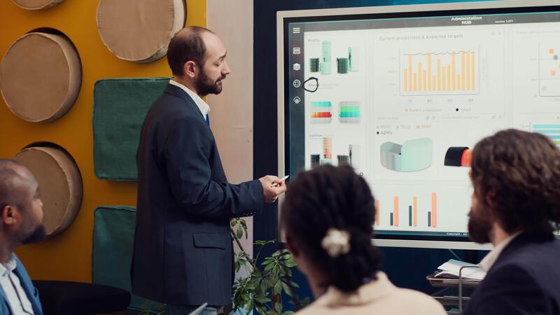 Project team reviewing monthly reports and data on interactive board, studying market trends and customer needs to ensure objectives fulfillment. Workers accomplish business goals. Camera A. Pro Video