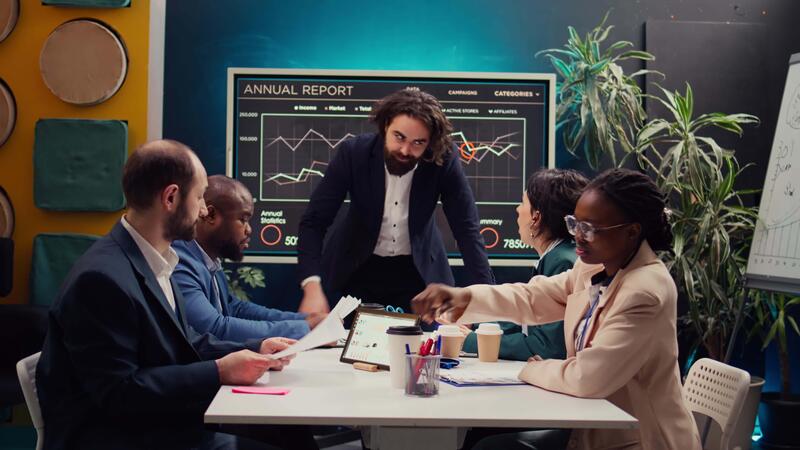 Startup team analyzing success metrics and key performance indicators to follow updates and establish changes, status update meeting. Coworkers measure progress towards strategic goals. Camera B. Pro Video