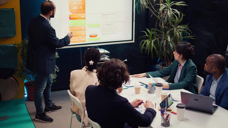 Sales manager creates a presentation to pitch in a new strategy for development, using interactive board to make his staff members understand the objectives. Business planning meeting. Camera B. Pro Video