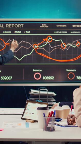 Skilled project team reviewing annual reports market trends in briefing meeting, knowing what to improve in order to guarantee customer experience and satisfaction. Enterprise development. Camera B. Pro Video