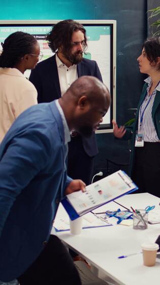 Team of startup colleagues preparing their presentation speech in front of the interactive board. Office employees meeting in a boardroom to review performance metrics as a group. Camera B. Pro Video