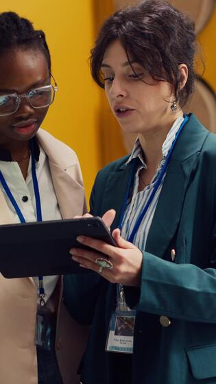 Team of business analysts reviews feedback on previous projects to work for future improvements, studying digital marketing strategies in coworking space meeting room. Startup enterprise. Camera A. Pro Video