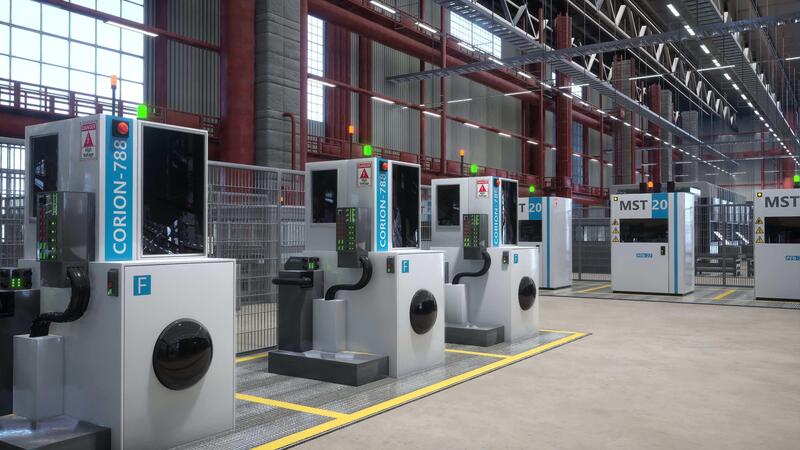 Facility with rows of industrial machines used for processing tasks, with green and orange led lights showing level of completion, 3D rendering. CNC machinery in modern manufacturing warehouse Pro Video