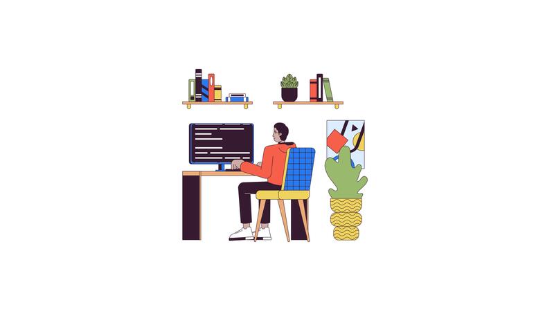 Hindu male programmer working on computer line 2D character animation. Home office flat color cartoon 4K alpha channel. man software developer animated person on white background Pro Video