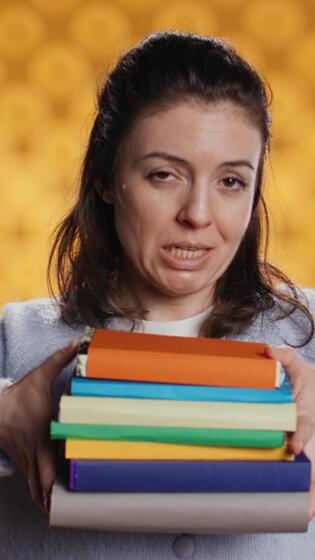 Vertical Woman choosing between physical books and ebooks, favoring ereader for lightness, studio background. Bookworm picking digital literature on tablet in front of heavy stack of novels, camera B Pro Video