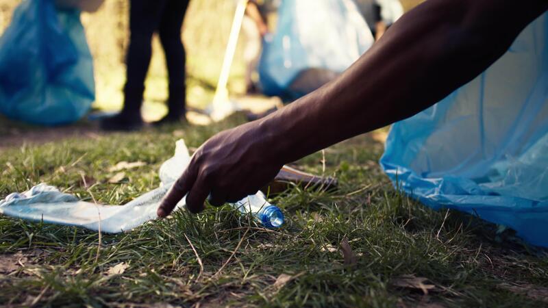People supporting cleanup of the natural environment by grabbing recyclables and trash objects from the woods, collecting in a garbage bag. Using utensils to pick up rubbish. Close up. Camera B. Pro Video