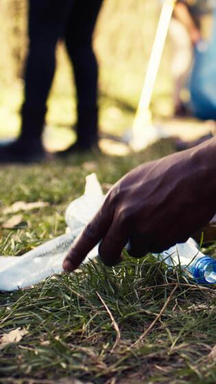 People supporting cleanup of the natural environment by grabbing recyclables and trash objects from the woods, collecting in a garbage bag. Using utensils to pick up rubbish. Close up. Camera B. Pro Video