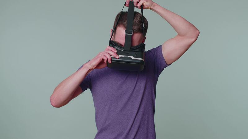 Man using virtual reality futuristic technology VR headset helmet to play simulation 3D game Pro Video
