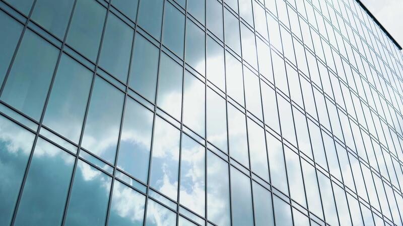 Moving the clouds is reflected on the windows of the office. Clouds reflected on the glass of a large office building Pro Video
