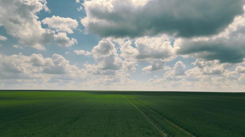 Fast flight over a field of green wheat and fast moving clouds. Timelapse field landscape with clouds Pro Video