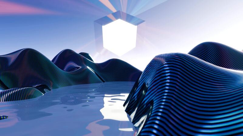 a computer generated image of a mountain range with water Pro Video