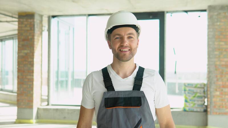 Portrait of an engineer in a helmet with yellow balance ruler at a construction site. Bubble level ruler close up view, measuring and leveling concept Pro Video