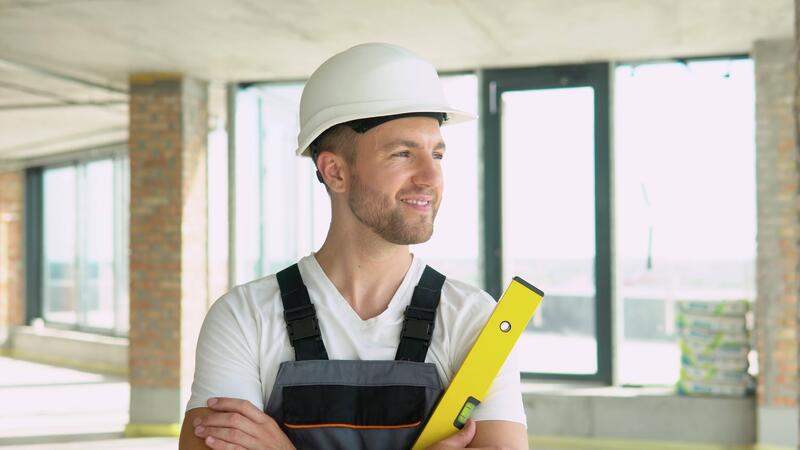 Portrait of an engineer in a helmet with yellow balance ruler at a construction site. Bubble level ruler close up view, measuring and leveling concept Pro Video