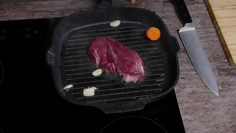 Sliced carrots and garlic are added to a piece of raw beef that has just started to cook in a frying pan with boiling oil. Cooking lesson. Close up. Slow motion. Top view Pro Video